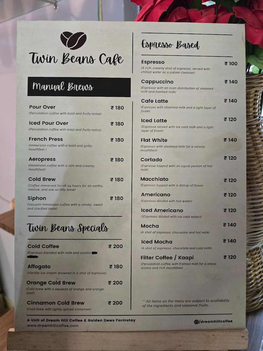 Dream Hill Coffee specializes in an array of meticulously crafted coffee concoctions that cater to aficionados and casual sippers alike. Start your morning with a robust Espresso, priced at just ₹100, or indulge in a smooth Cappuccino or velvety Café Latte for ₹120. For those looking for a refreshing twist, the Iced Latte and Iced Mocha at ₹120 and ₹140, respectively, are perfect choices to cool down while enjoying the serene ambience.
